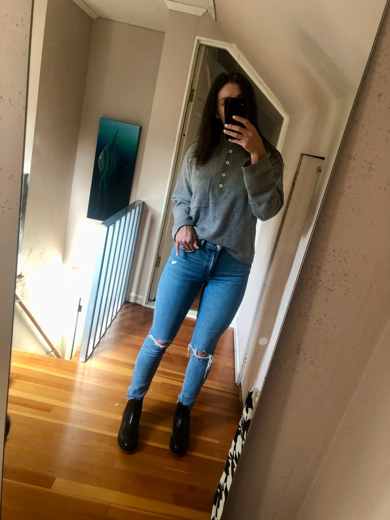 Jeans: Reformation – I LOVED these jeans when I got them and they were too long and too tight. So, I kept them for a few months until the fit… (I know, I know) and I got them hemmed. Which would’ve been great if the original hem wasn’t already fashionably “destroyed”. The tailor cut that right off and I got them back with a beautiful finished hem – which i hated. So, it’s been a process of re-destryoing the hem if you will. It’s also been a process of WILLING these jeans to fit through lots of stretching and shimmying and not washing and voila, they’re one of my favorite pairs now. I love the color a lot.